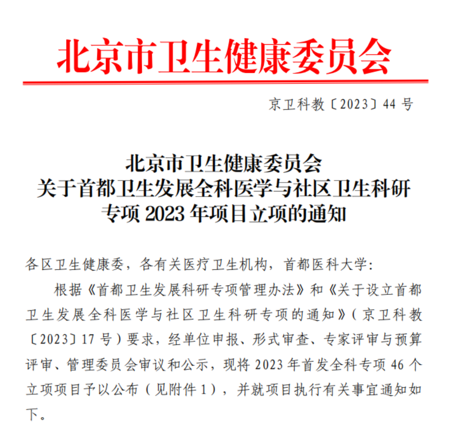 提出在首都卫生发展科研专项下设全科医学与社区卫生科研专项(以下简称首发全科专项)。在学校领导和相关部门以及市卫生健康委的支持下,2023年6月北京市卫健委设立首发全科专项。
